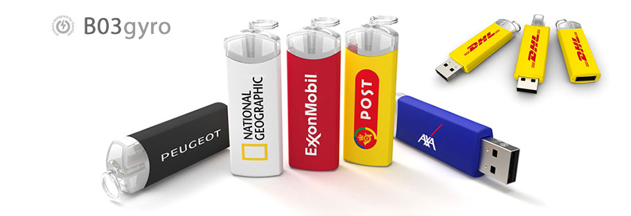 Elegante y bonito, este modelo único cuenta con una base rotatoria que se abre y se retrae para dejar salir el conector USB. Este mecanismo innovador hace del B03 Gyro un regalo corporativo ideal. El B03 Gyro puede ser impreso en serigrafía por ambas caras y cuenta con una anilla en la que se puede añadir un llavero o cinta para el cuello. Todos los precios presupuestados incluyen la serigrafía en 1-4 colores con su logotipo.