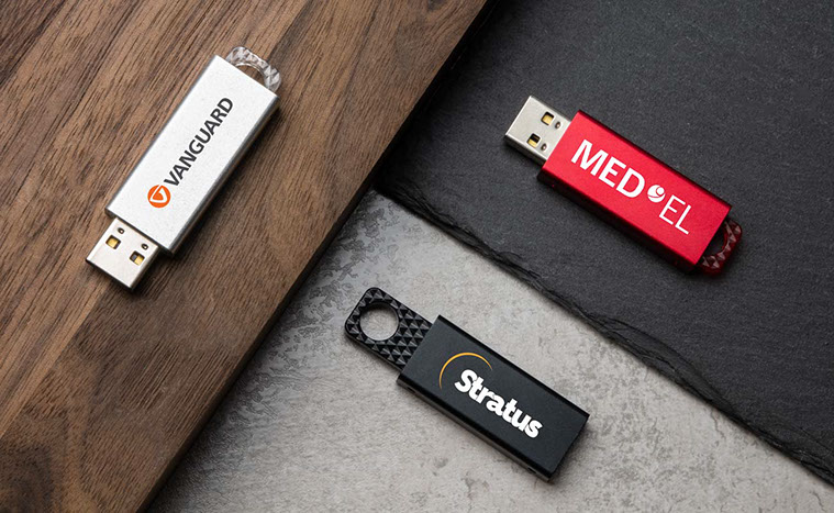 Nuestro modelo B27 Memo presenta un acabado metálico suave, listo para ser serigrafiado o grabado a láser con su logotipo. La elegante y funcional pieza superior, revela y retrae el conector USB. Se puede añadir fácilmente a un juego de llaves o cinta para el cuello.