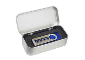 Estuche para Memoria USB BÁSICA presentación de aluminio el cual contiene una espuma gris con un corte que se ajusta al producto. Si es requerido se puede serigrafiar en color o grabar en láser con su logotipo.