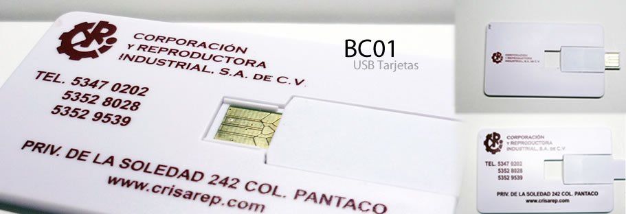 Modelo BC01 Card, Tarjeta USB Básica, chip giratorio cuenta con un amplia área de impresión aplicando marcado en serigrafía hasta 4 tintas o Full Color a base de Rayos UV o Tampografía.